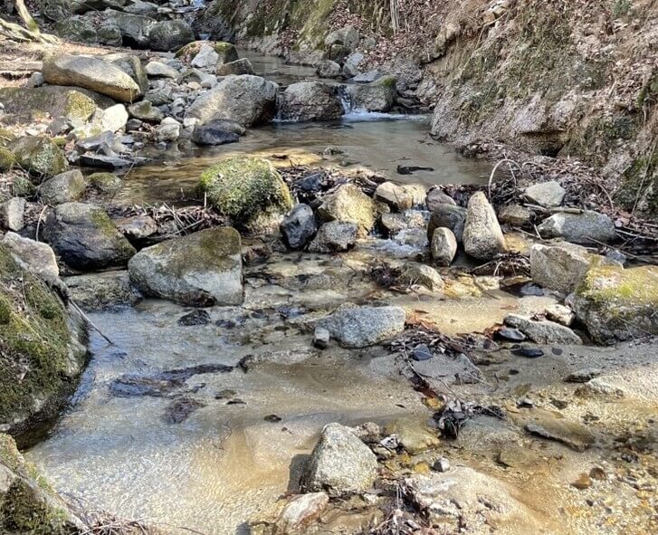 水量が少ないので水で深く掘られるところも無いため水温の変化も激しそうですし、魚の隠れ家もほとんど見当たりません。この環境で生き延びるのはコイ科の魚でも難しいかもしれません。