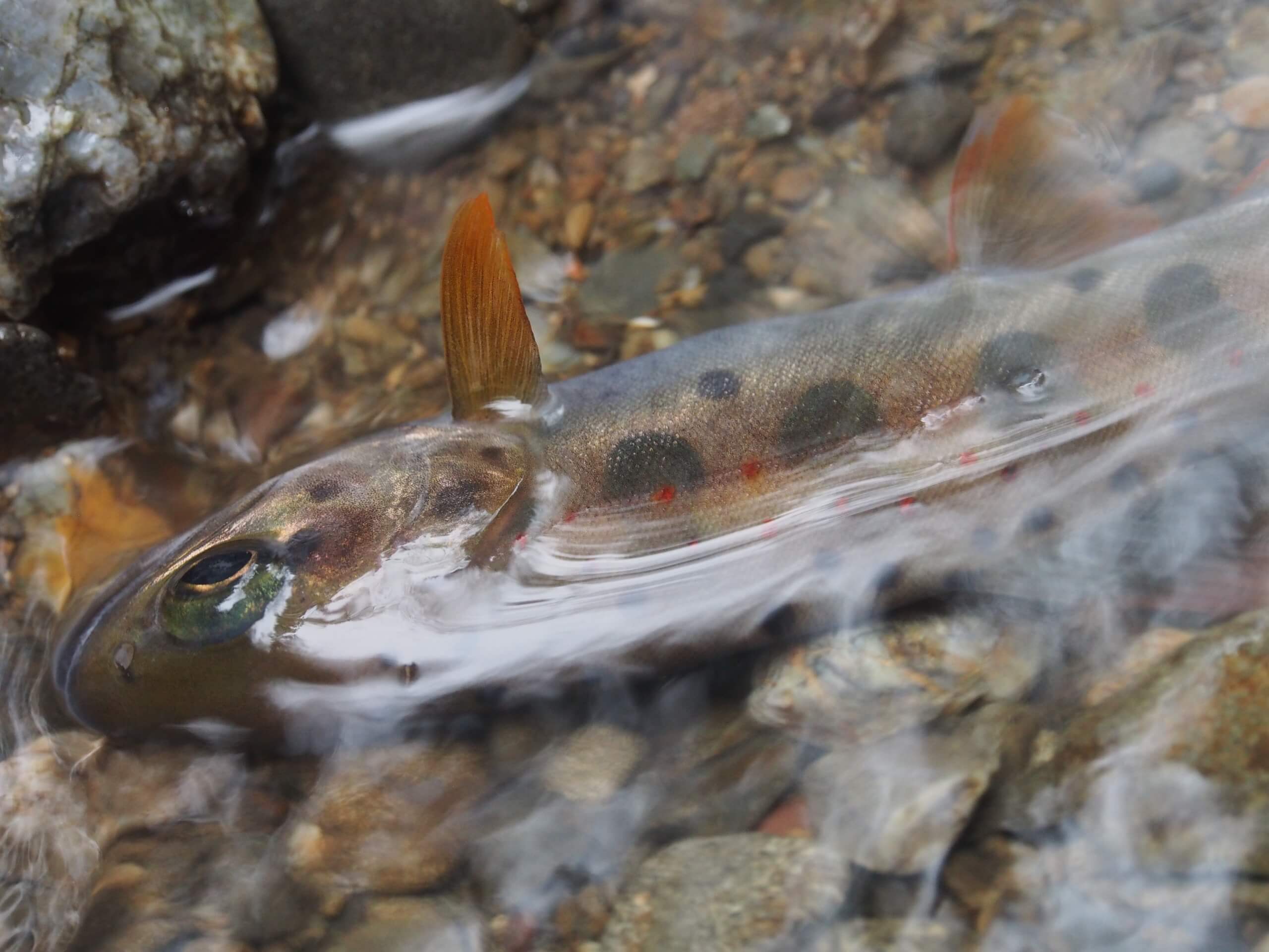 釣り上げたのは待ち望んだアマゴでしたが、写真を見てみると典型的な水族館で見るアマゴの形をしています。尾びれの下は擦り切れ、豊富な餌に恵まれていたのか美味しそうにぷっくり太っています。